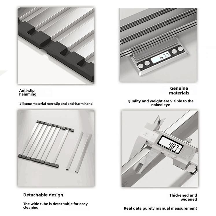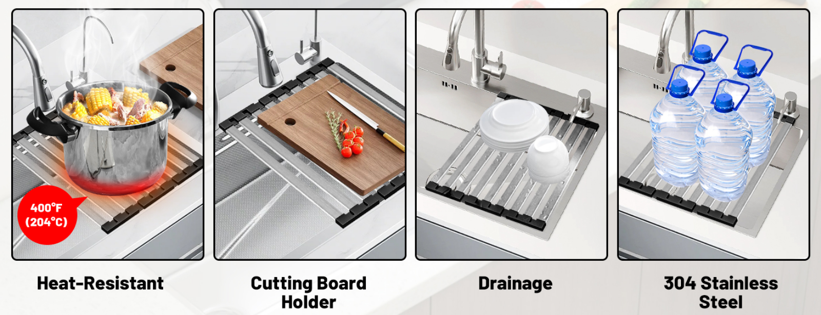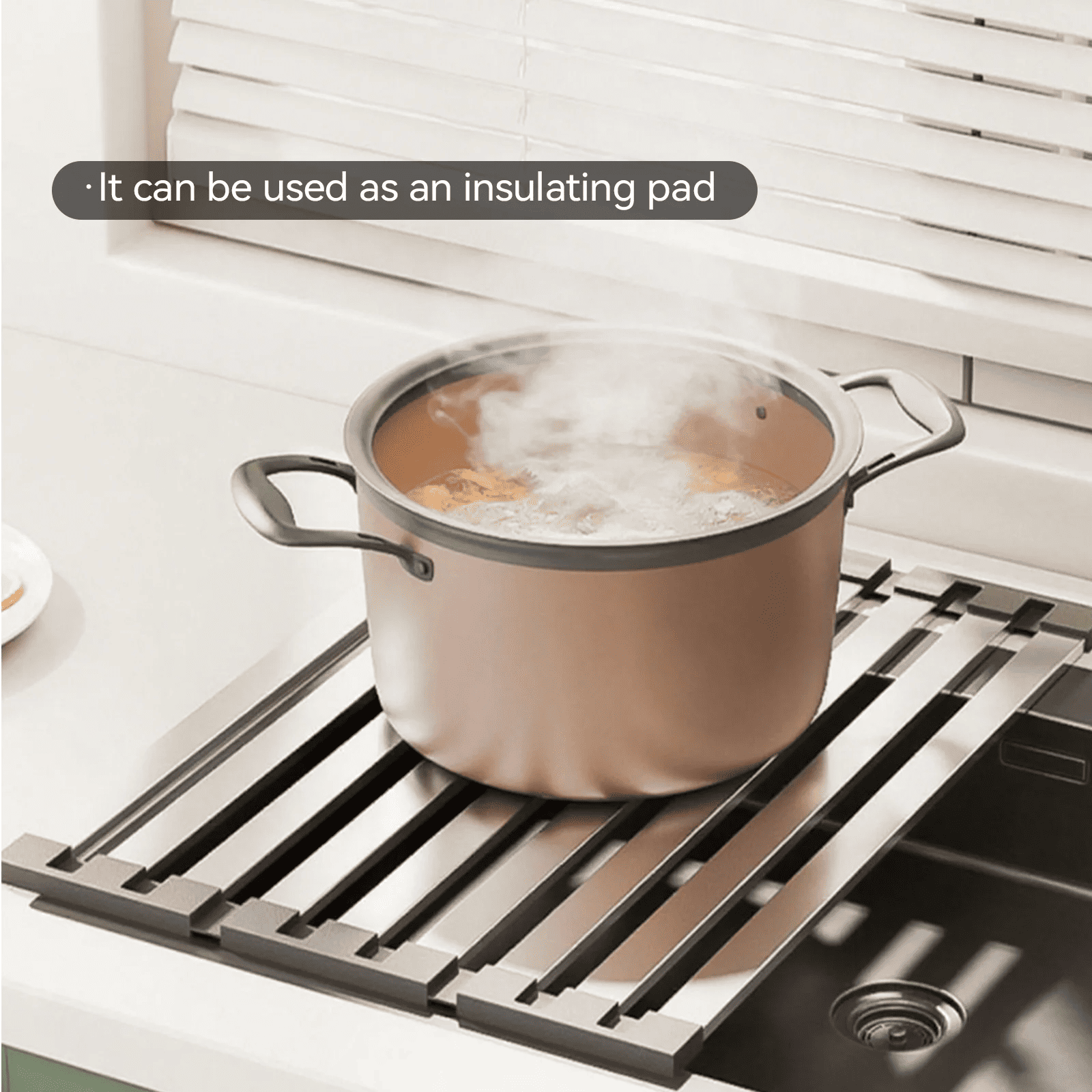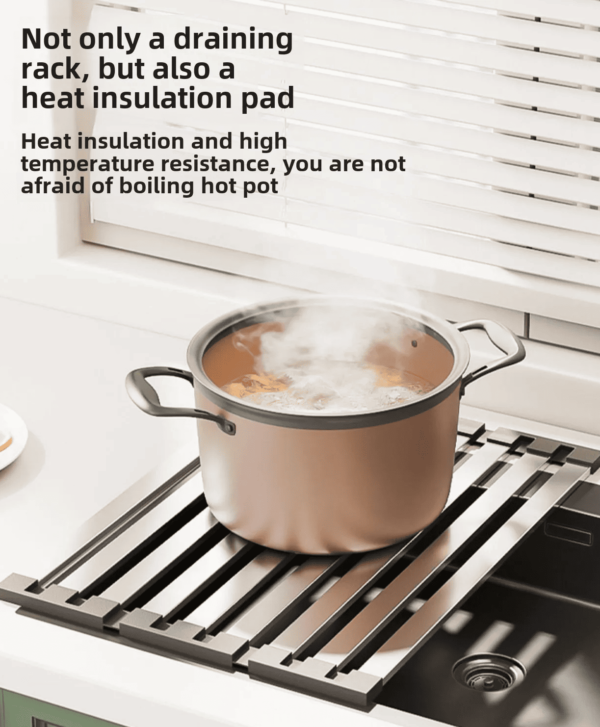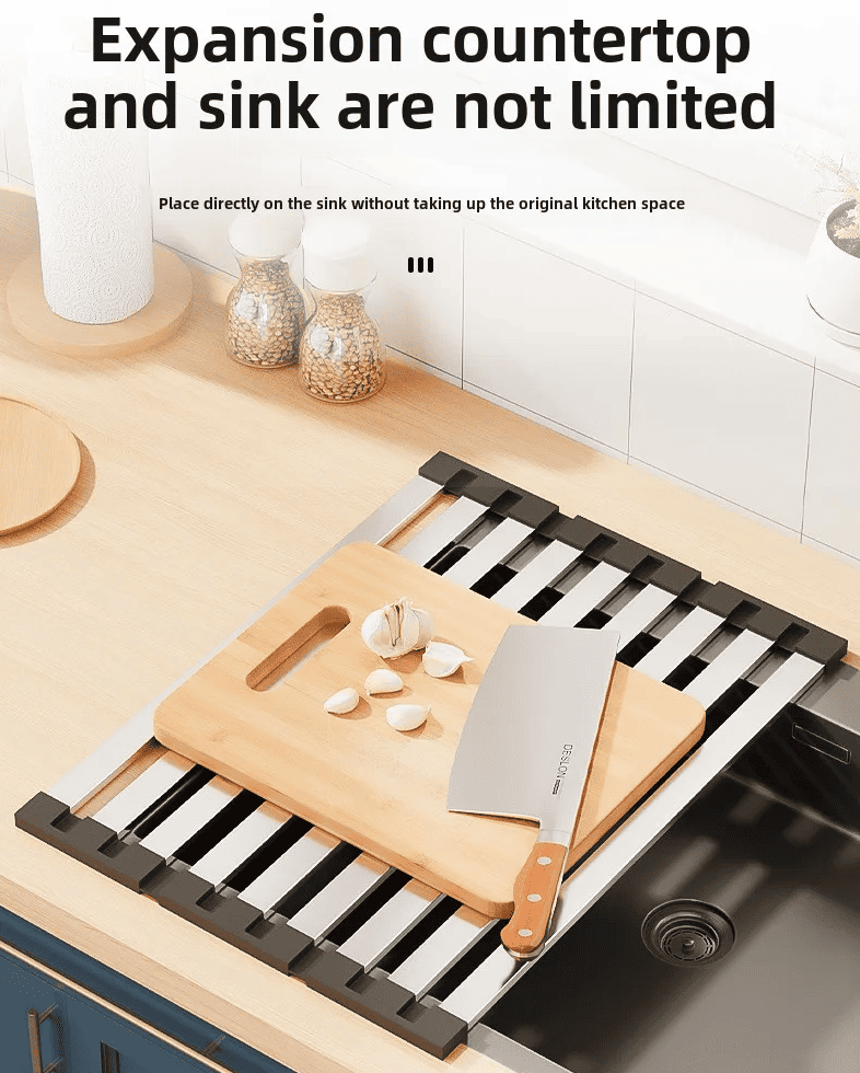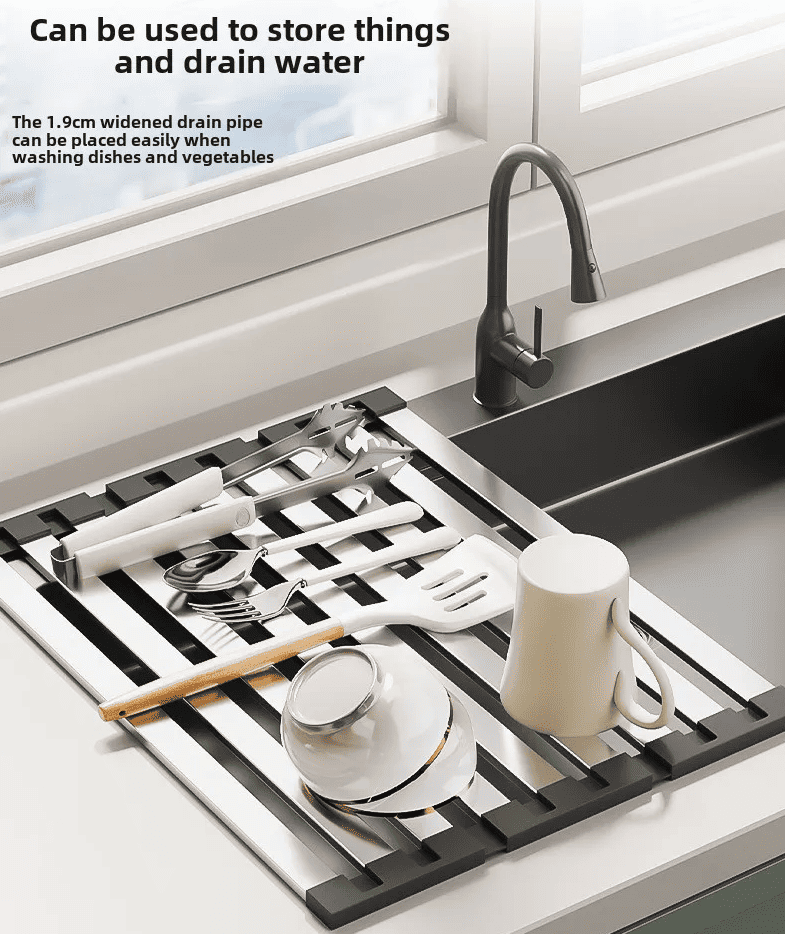 Versatile Functionality: This multi-purpose rack serves as a drainer for kitchen utensils, a water controller for fruits and vegetables, a cutting board, or a pot mat.