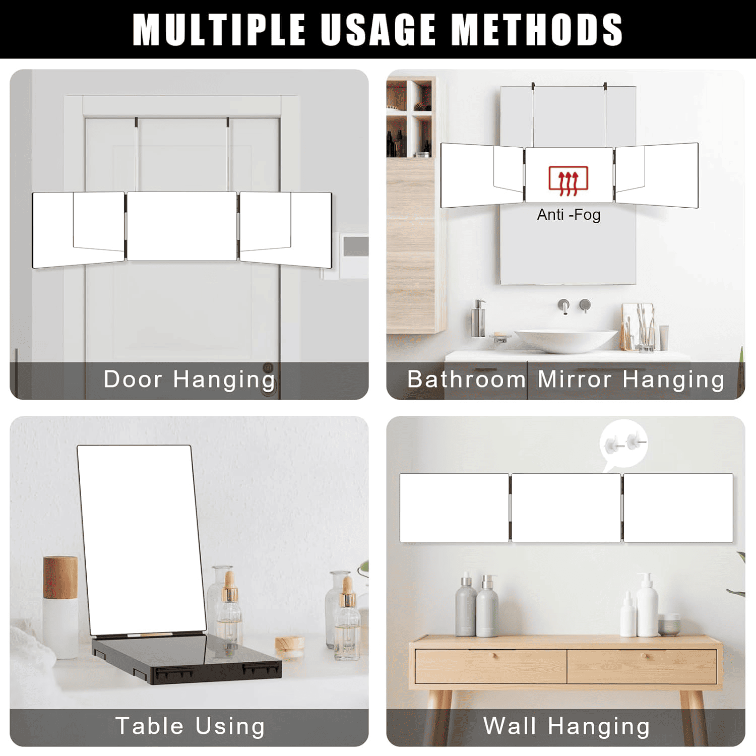 - Adjustable Hooks - Our tri fold mirror has 3 ways to use, you can choose to hang it on the wall, door or table according to your needs. And the height is adjustable, very convenient to adjust the height what you want. The hooks can be firmly hung in the door and the package comes with 2 traceless nails, also can be firmly hung on the wall.