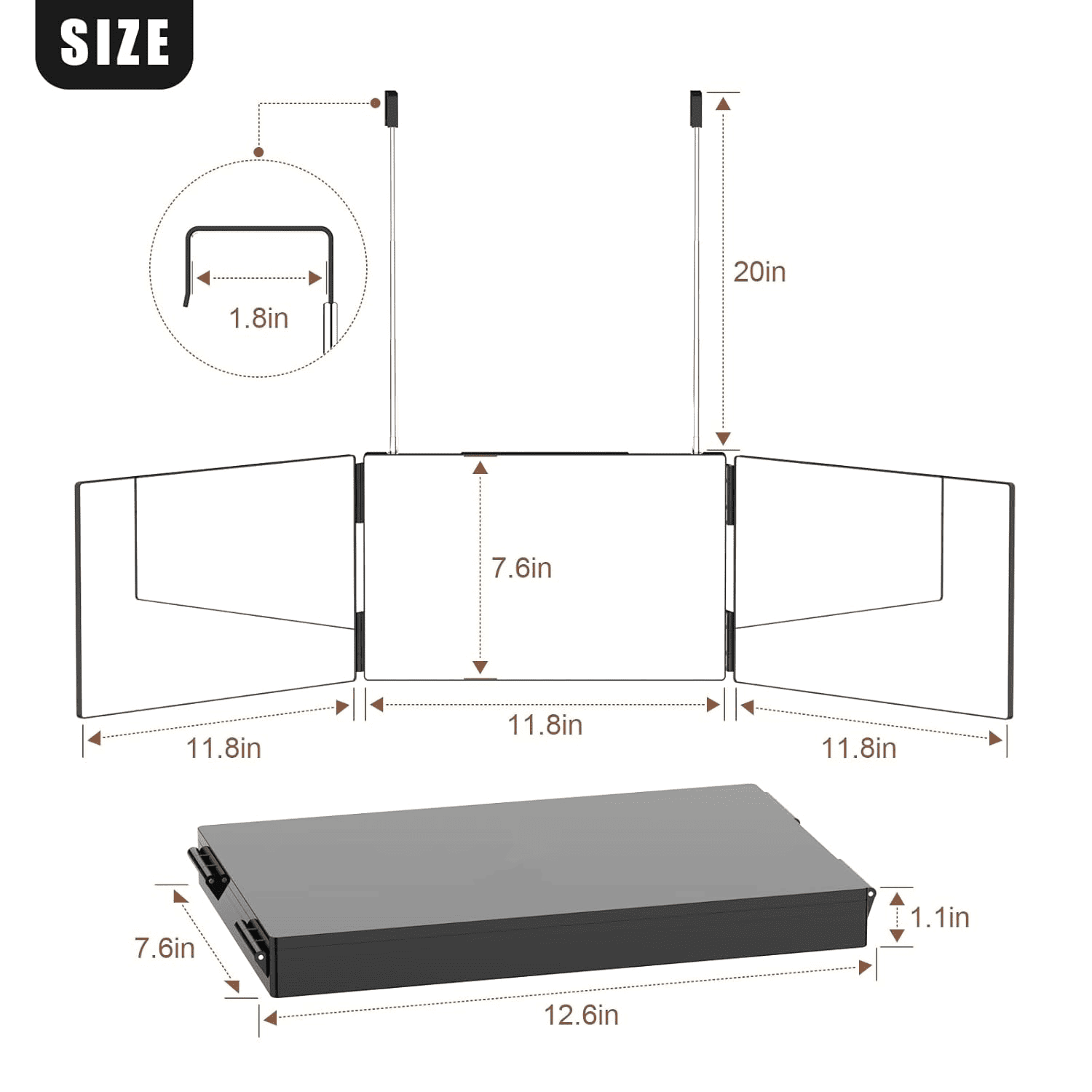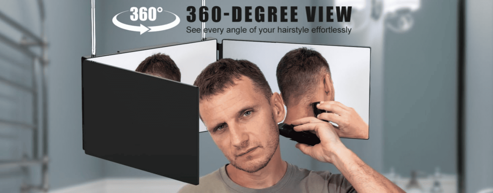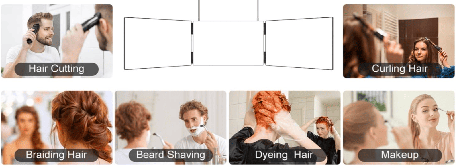 - 360 Degree View - The 3 way mirror provides a 360 degree view to eliminate blind spots and easily adjusts the angle of the mirrors on both sides to see the back of your head, allowing you to comfortably see all angles of your head for haircutting, shaving, dyeing, styling, and makeup application.